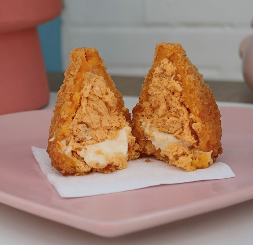 Nossa coxinha de batata doce, recheada com frango e cream cheese, empanada na farinha panko. Crocante por fora, macia por dentro e bem recheada. Aproximadamente 180g.