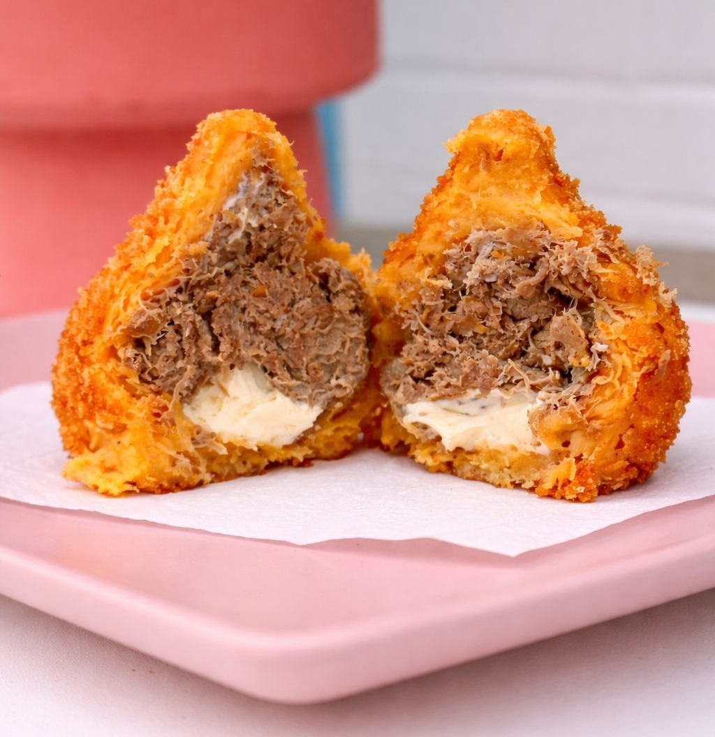 Coxinha de carne na nata com queijo coalho, feita com massa de macaxeira bem cozida e temperada, recheada com carne de sol desfiada, creme de nata e queijo coalho, empanada na farinha panko. Crocante por fora, macia por dentro e bem recheada. Aproximadamente 180g.