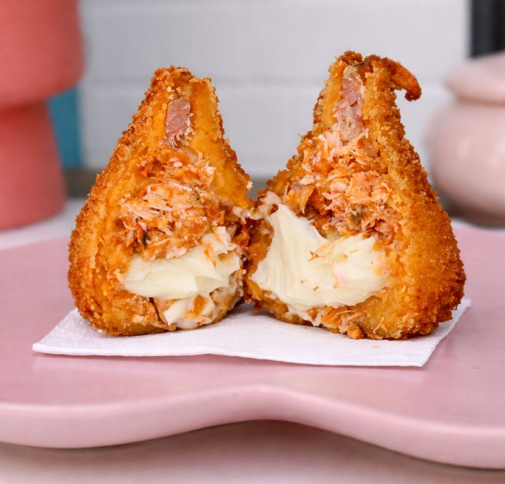 Nossa coxinha de camarão com cream cheese, feita com massa tradicional bem temperada, recheada com pedaços de camarão e empanada na farinha panko. Crocante por fora, macia por dentro e bem recheada. Aproximadamente 180g