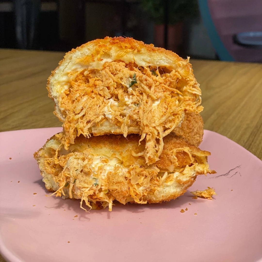 Peso 180g. Massa tradicional temperada recheado com costelinha suína ao molho barbecue e cream cheese empanado com farinha Panko.