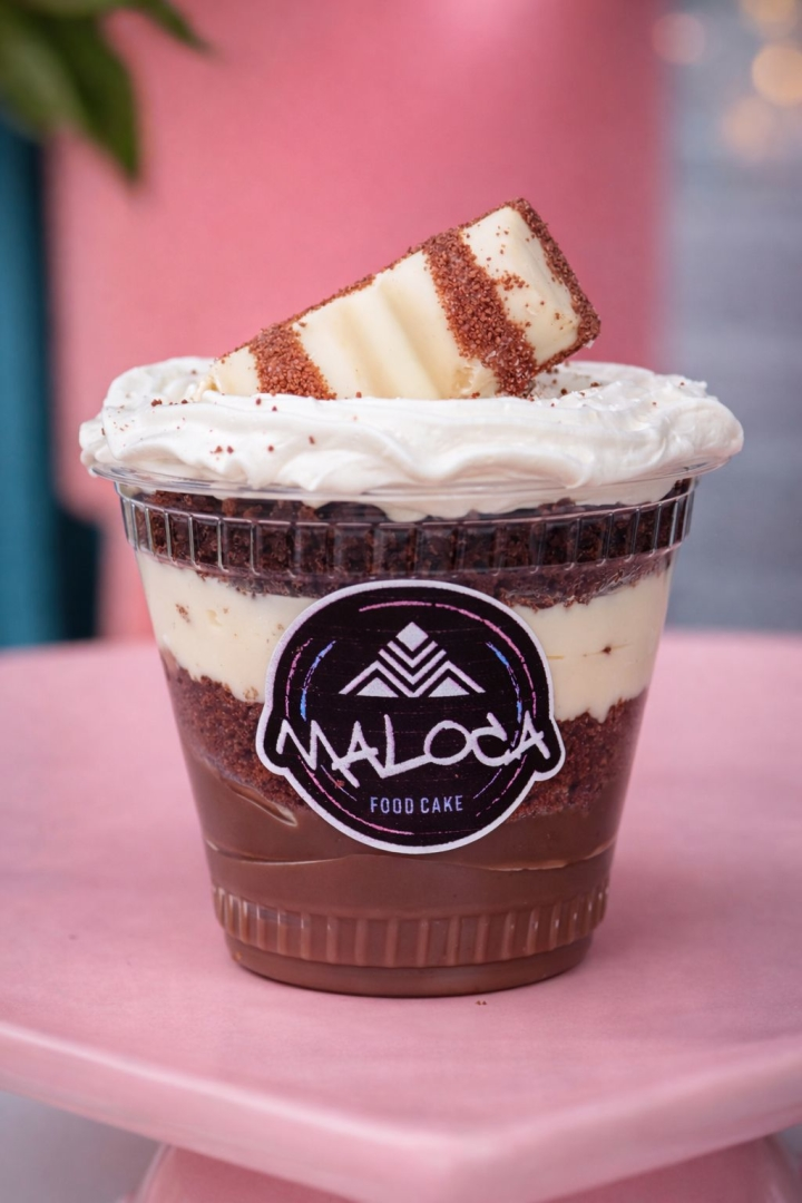 Copo de 300ml (265g), Recheio de Brigadeiro Cremoso, Massa Amanteigada de Chocolate, Recheio Cremoso 5 Leites, Finalizado com Chantininho Power e Kinder Bueno.