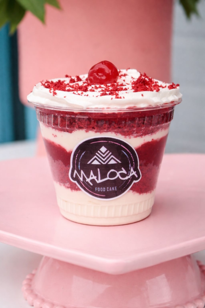 Copo de 300ml (260g), Creme de 5 Leites branco, Massa Red, Geleia de Morango, Finalizado com Chantininho Power e Cereja.