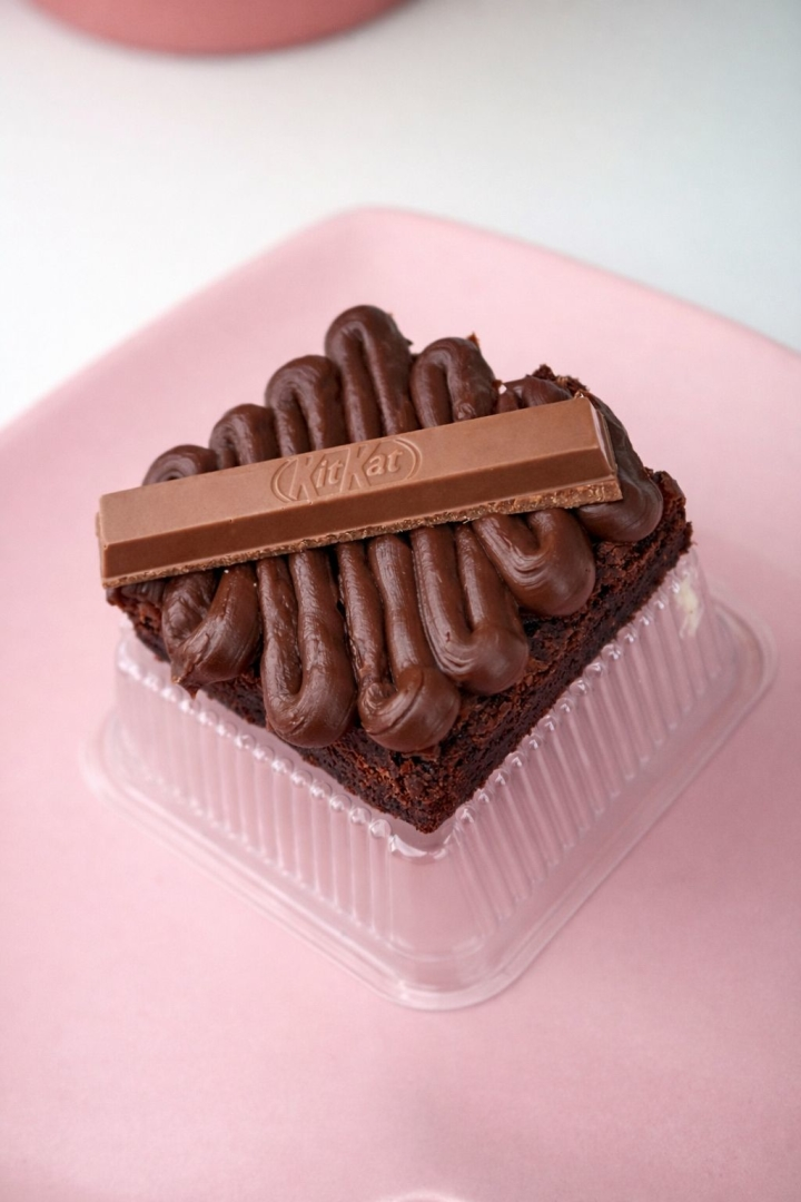 Brownie de chocolate intenso, macio por dentro, coberto com nosso brigadeiro cremoso de panela e finalizado com pedaços de Kit Kat.