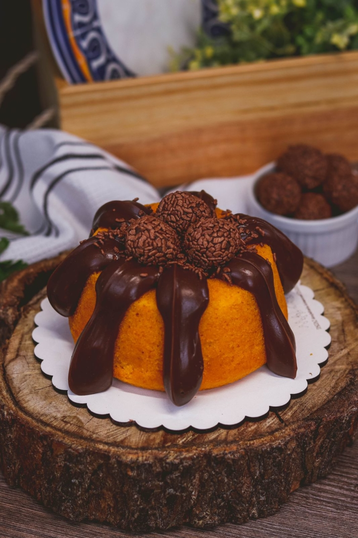 Peso (600). Massa de Cenoura, Recheio de Brigadeiro Trufados, Decorado com Brigadeiros.