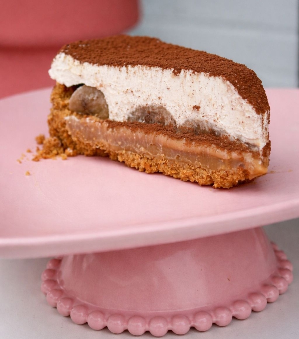 Fatia de Banoff 🍌 Base de biscoito amanteigado, com doce de leite caseiro, bananas frescas e nosso chantininho power. Finalizada com cacau 100%.