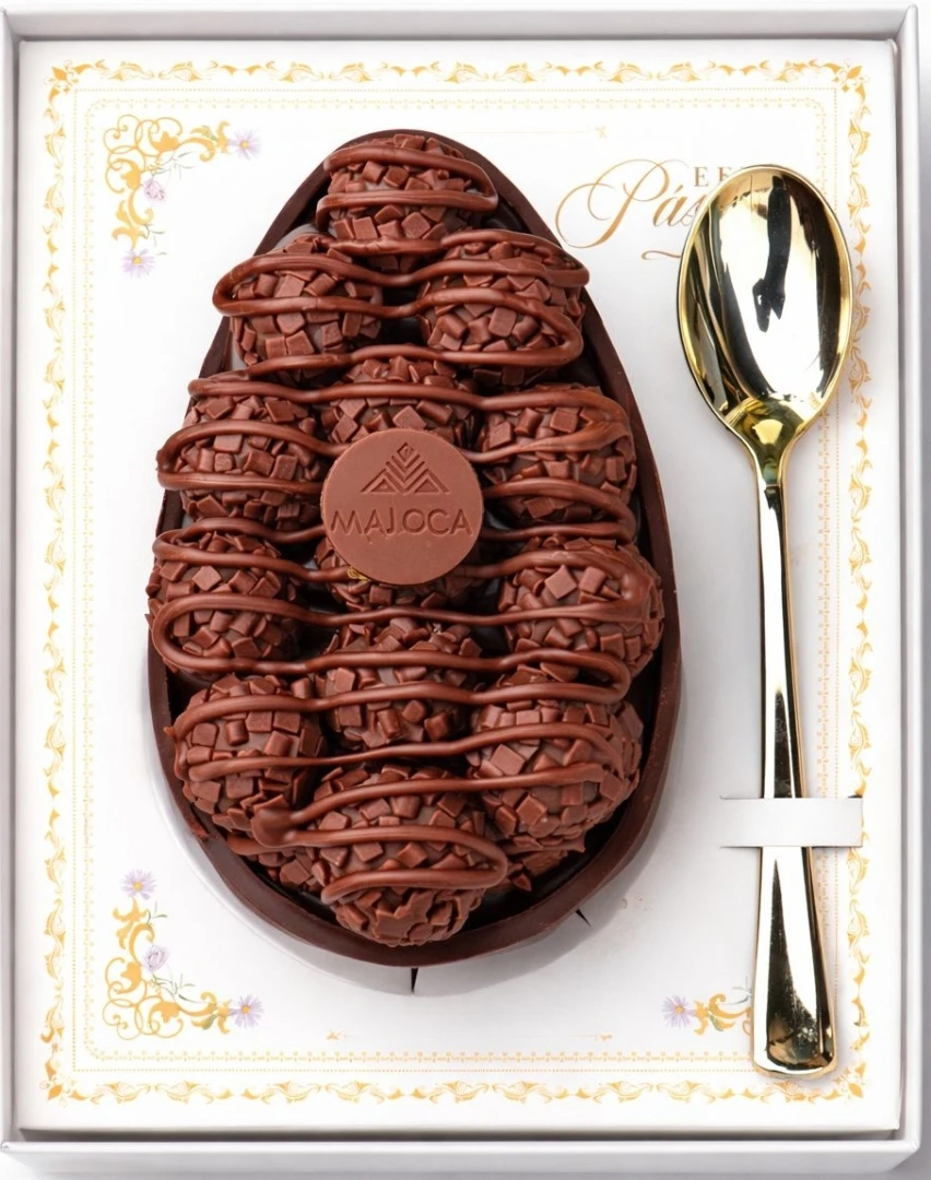 Casca de chocolate nobre meio amargo, recheada com brigadeiro trufado e massa de chocolate. Para finalizar, brigadeiros enrolados com granulé Melken e fios de nutella.