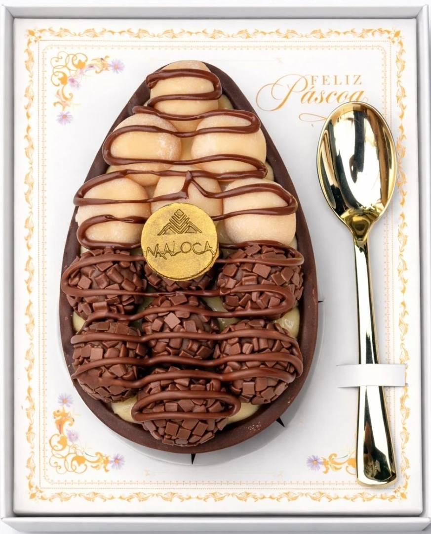 Casca de chocolate nobre meio amargo, recheada com brigadeiro de leite Ninho orignal, massa de chocolate, massa amanteigada, brigadeiro trufado. Finalizado com brigadeiros enrolados de leite Ninho, chocolate e um fio de Nutella.