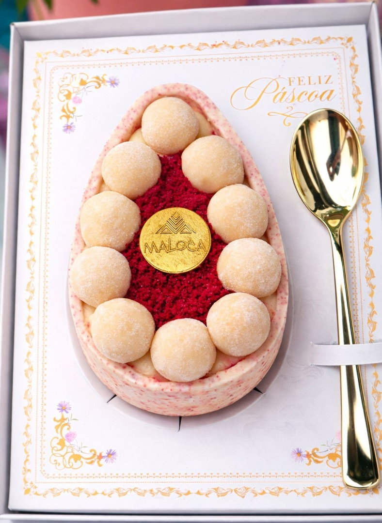 Casca de chocolate branco nobre com pedacinhos de massa Red Velvet. Recheada com creme de leite ninho, geleia de morango artesanal e massa de bolo Red Velvert. Finalizado com brigadeiros enrolados de leite ninho.