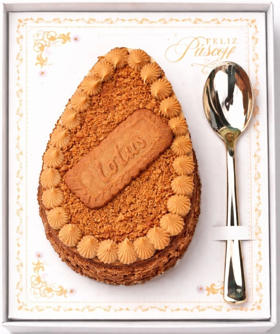 Casca de chocolate branco nobre com pedaços de biscoito Lotus Biscoff, recheado ninho original, massa amantegada e pasta de lótus. Finalizado com pitangas de doce de leite, farelo do biscoito lotus e um biscoito lotus inteiro no centro.