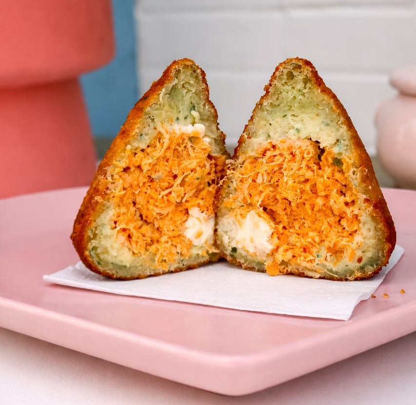 Nossa coxinha de camarão com cream cheese, feita com massa tradicional bem temperada, recheada com pedaços de camarão e empanada na farinha panko. Crocante por fora, macia por dentro e bem recheada. Aproximadamente 180g